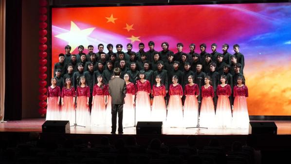 合唱演出精彩纷呈, 一首壮阔的《祖国颂》,满怀激情地颂赞了新中国成立以来取得的辉煌成就,同学们在歌声中表达了对共产党浓浓的感激之情,两名退伍军人的加入使得合唱表演更加撼人心魄;《唱支山歌给党听》中,同学们饱含深情的歌声将对中国共产党的热爱表达的淋漓尽致,坚毅的神情传达着愿意为祖国奉献一切的决心;《不忘初心》将有声的音乐与优美的舞蹈完美融合,伴随着钢琴美妙的旋律,同学们的歌声里饱含着对中国共产党的无限歌颂;《我们从古田再出发》同学们通过掷地有声的音符,以铿将有力的歌声为介,唱出了对中国共产党的信赖和支持;短促跳动、振奋人心的《保卫黄河》,把响亮的战斗口号化为有力的节奏,将中国共产党的奋斗拼搏精神通过激情昂扬的歌声展现了出来;满含真情的《祖国不会忘记》歌颂着在祖国大陆上用血书写新中国历史的共产党,赞扬着在艰难时代里奋起拼搏、甘于寂寞打开新中国大门的默默奉献的中国人民。