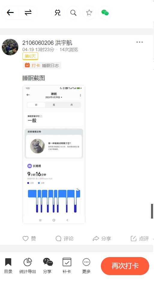 睡眠日志:良好的睡眠是保持身心健康和高效学习的基础。此次活动通过睡眠日志打卡,引导同学们科学规划作息时间,确保充足的睡眠,保持充沛的精力投入到学习和日常生活中。