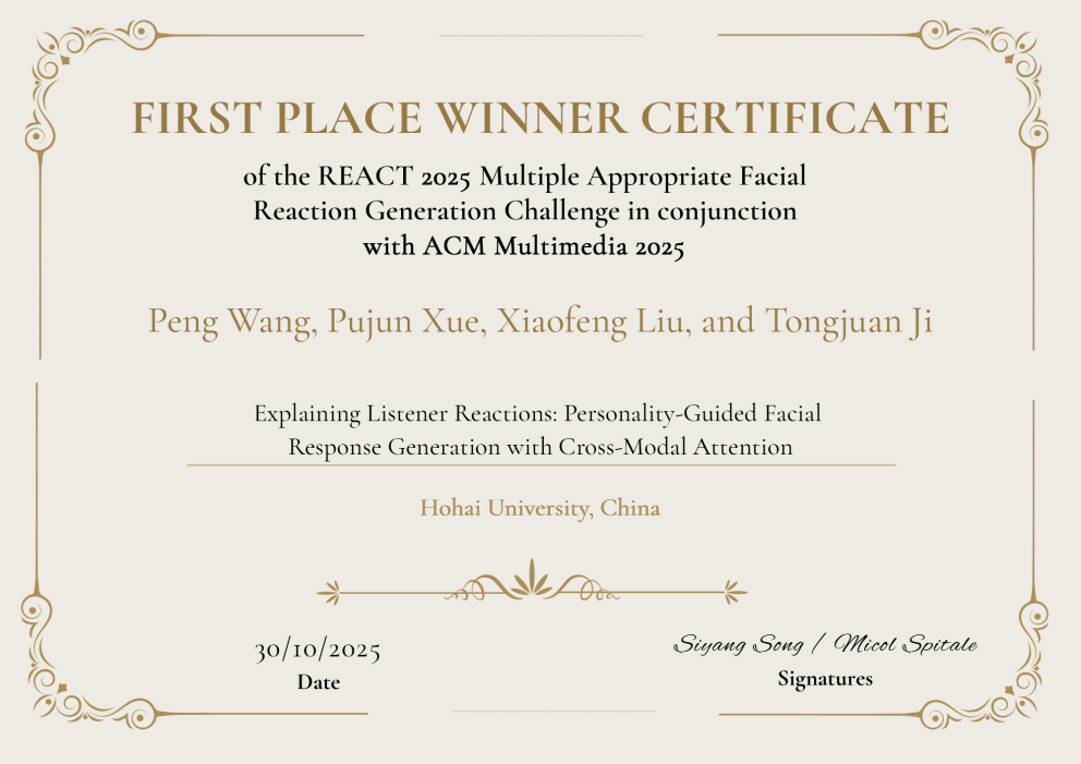 2025年10月30日,在爱尔兰都柏林举办的ACM国际多媒体会议(ACM International Conference on Multimedia, ACM MM 2025)上,公司刘小峰教授团队在第三届REACT国际挑战赛(The REACT 2025 Multiple Appropriate Facial Reaction Generation Challenge)中脱颖而出,夺得全球总决赛第一名。